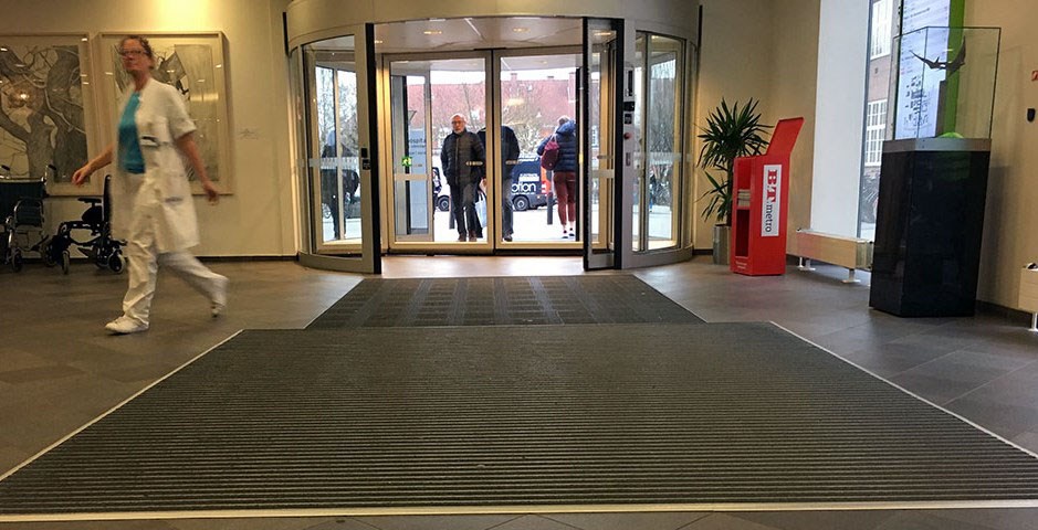 - Inden for dørene er der lagt længere måtter på gulvene, så ansatte, patienter og pårørende slæber mindre vand og snavs med ind. Det gør rengøringen lettere og mindsker risikoen for fald (se billedet øverst).
