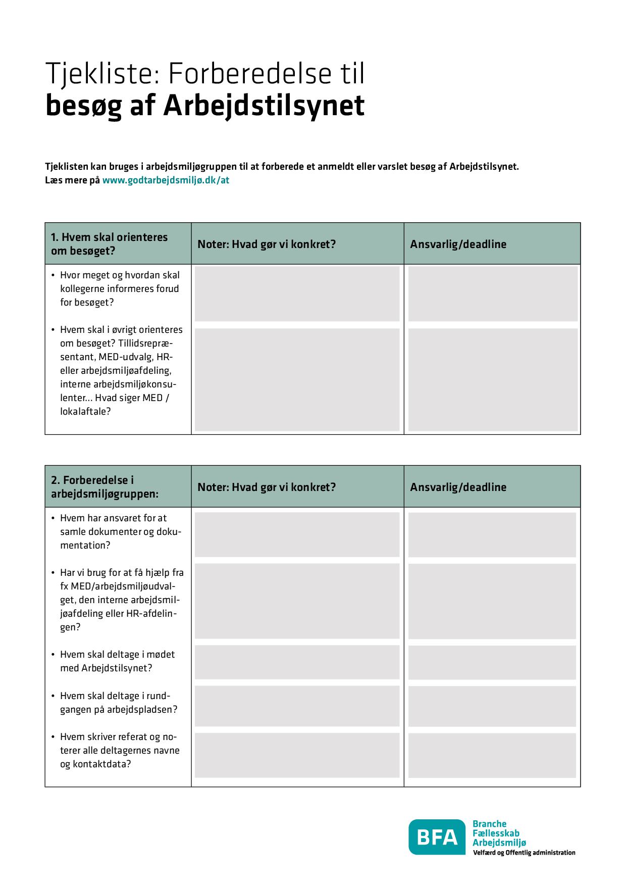 Tjeklisten kan bruges i arbejdsmiljøgruppen til at forberede et anmeldt eller varslet besøg af Arbejdstilsynet. Læs mere på www.godtarbejdsmiljø.dk/at