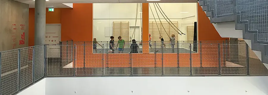 Ovenpå stueetagen med administration, cafe og børnehus ligger tre etager for hhv. indskoling, mellemtrin og udskoling. Ruminddeling og indretning passer til de forskellige alderstrin.