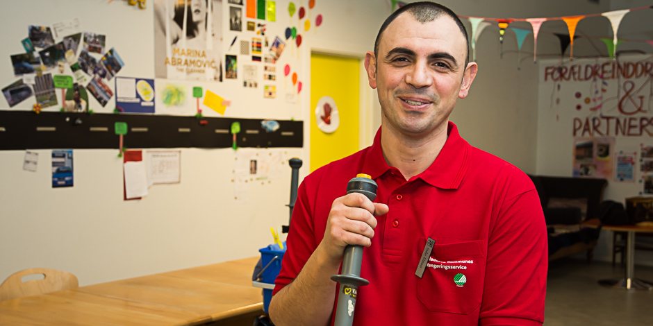 Sadat Elmazi møder os med et stort smil i daginstitutionen Sneglehuset 1. Han er lige blevet færdig med dagens rengøring, og han stråler af stolthed.