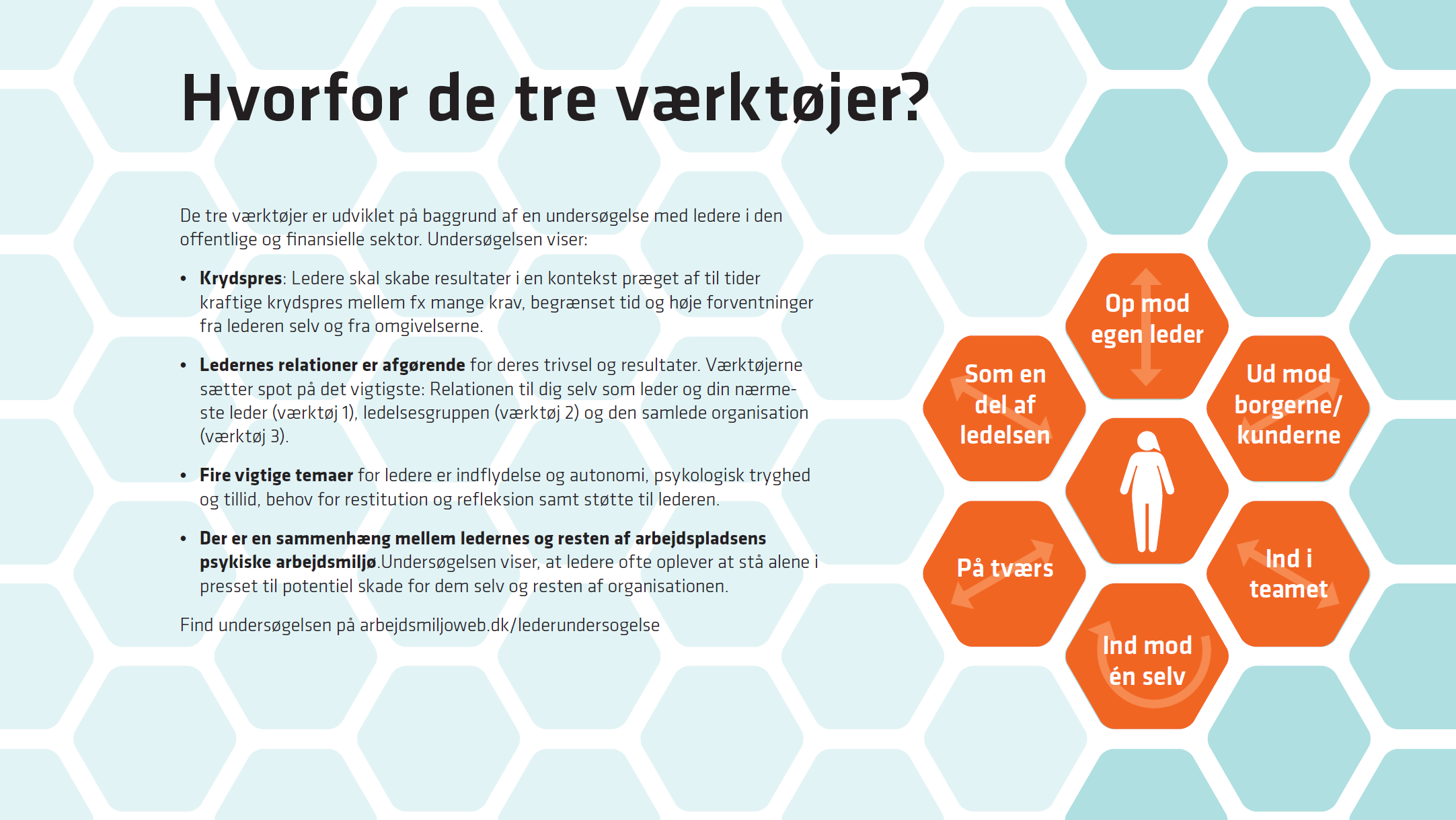 Værktøjerne har afsæt i en undersøgelse af lederes psykiske arbejdsmiljø. Undersøgelsen viser, at lederne vurderer relationen til sig selv og nærmeste leder som vigtige for deres arbejdsmiljø – og det samme gælder relationen til ledergruppen. Det forklarer de to første værktøjer. Med det tredje vil vi gerne give arbejdspladsen en samlet ramme for at arbejde med lederes psykiske arbejdsmiljø.