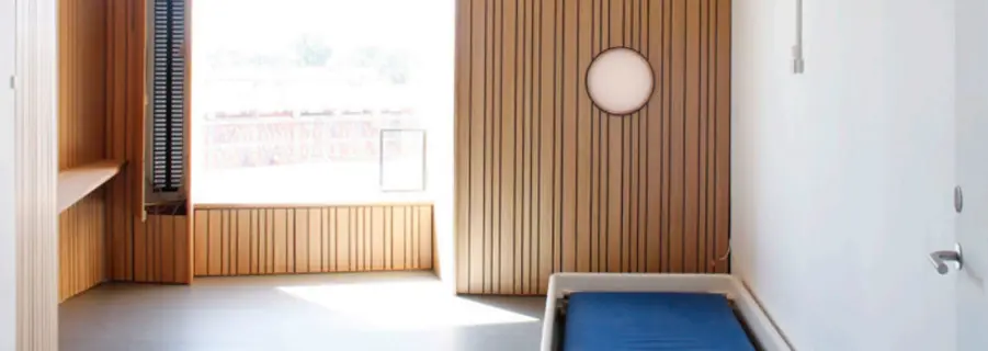 De nye sengestuer på Ny Psykiatri Bispebjerg er indrettet med akustiklofter og -vægge, så der kommer en blød og kort efterklang i rummet. Det er også med til at skabe bedre vilkår for helingen af de psykiatriske patienter, der skal indlægges.