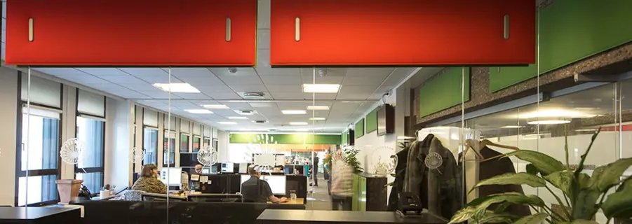 Alpha Akustik kom på banen, og noget af det første, sælgeren bemærkede, var, at kontorerne var adskilt med glasvægge. De kaster meget støj tilbage i rummet. Han anbefalede fire tiltag: