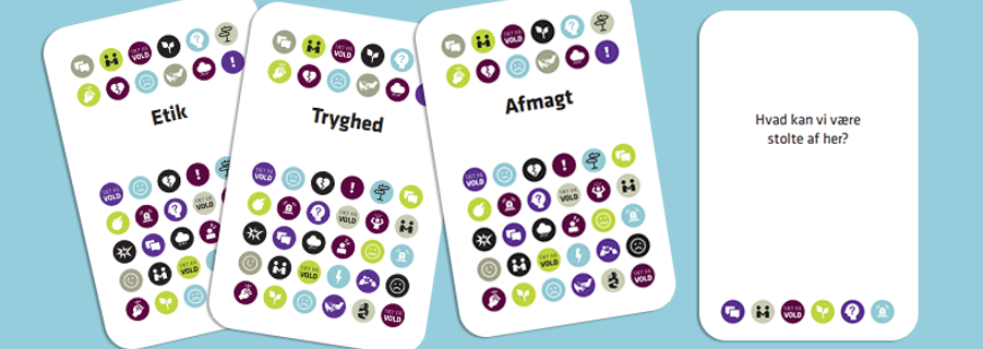 ’Tæt på vold’ er et simpelt kortspil beregnet til at blive brugt som afsæt for en dialog i en personalegruppe, hvor der er risiko for at blive udsat for trusler eller vold.