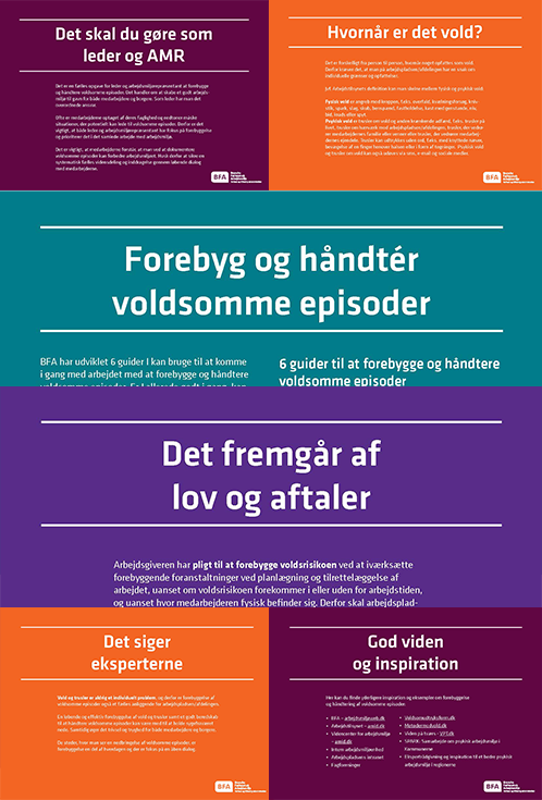 BFA har udviklet en seks guider og startkort I kan bruge til at komme i gang med arbejdet med at forebygge og håndtere voldsomme episoder. Guiderne er til jer der sjældent har trusler eller vold. Er I allerede godt i gang, kan guiderne bruges som inspiration til og gennemgang af det I allerede gør.